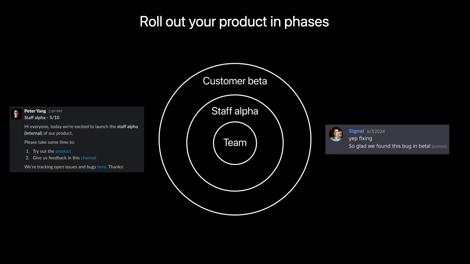 Ship to concentric circles. It’s almost always a bad idea to ship a new product to everyone at once. Instead, run staff alphas and customer betas to catch issues and improve quality before launch. I genuinely don't know how to build great products without a community of beta users I can talk to daily.