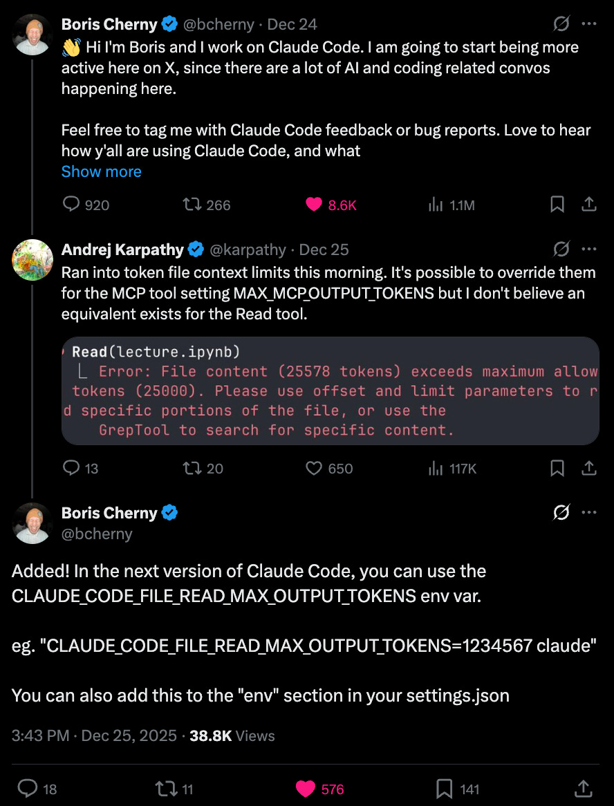 Example: Boris (the creator of Claude Code) asked for user feedback on X and got 100s of replies. He then worked with AI to ship dozens of fixes on the spot. He’s the perfect example of a small team (of 1 🙂) iterating fast with real users.