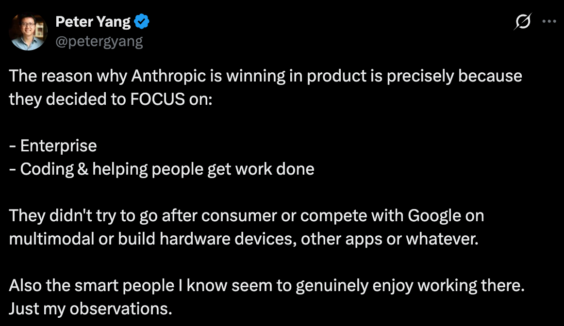 Lack of focus is an extremely common problem in successful tech companies. Anthropic is an example of a company that did it right: