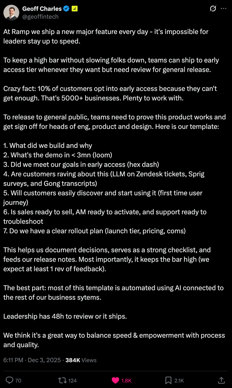 Example: Ramp grew to $32B in record time by empowering their teams to ship fast. As Geoff (Ramp’s CPO) explains in the post below, Ramp teams can ship to beta users at any time. The line that I particularly love is “leadership has 48h to review or it ships.” This puts accountability on execs not to slow down velocity.