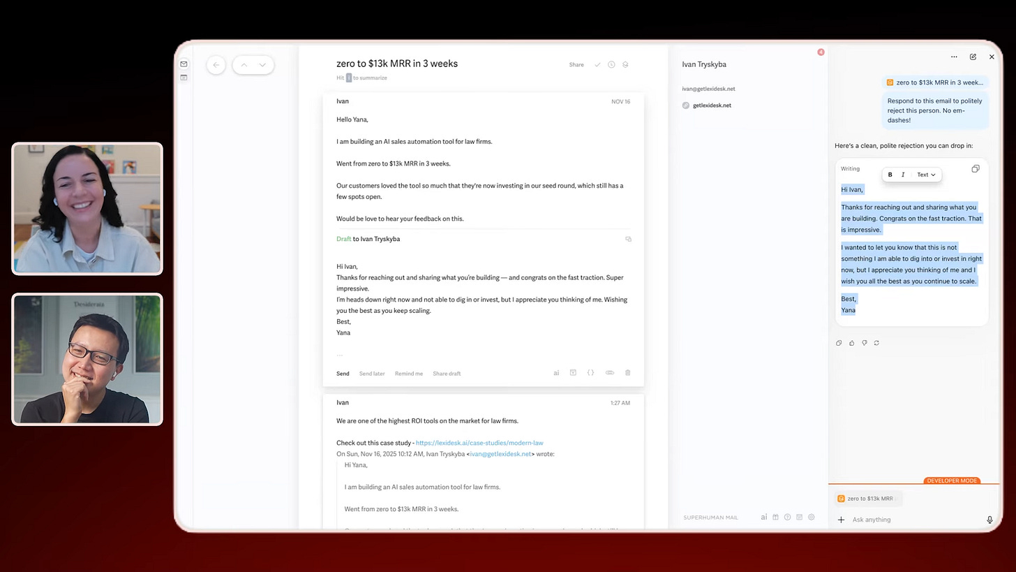 Yana is Head of AI at Amplitude and a good friend. We had some real talk about how to stay scrappy inside a big company, including how to avoid decision by committee and endless internal debates. Yana also demoed her favorite AI workflows to triage her emails and aggregate customer feedback. I think you’ll love our banter 😅