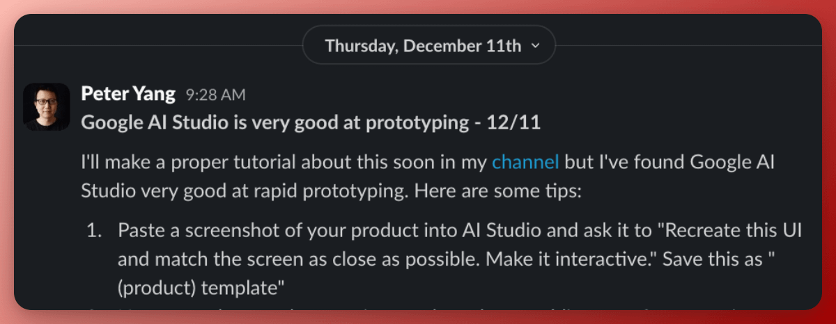 We’ve set up channels to share AI workflows, discuss industry news, rant about PM life, and (most importantly) post memes. I’ll share more raw tips like the one above as well. Come hang out with us during the holidays 🙂