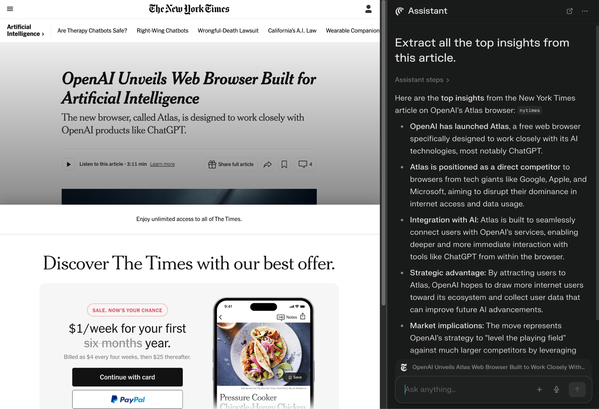 “Summarize this article on AI browsers.” I asked it to summarize a New York Times article (see above) that was behind a paywall. It did pretty well at reading the text behind the banner.