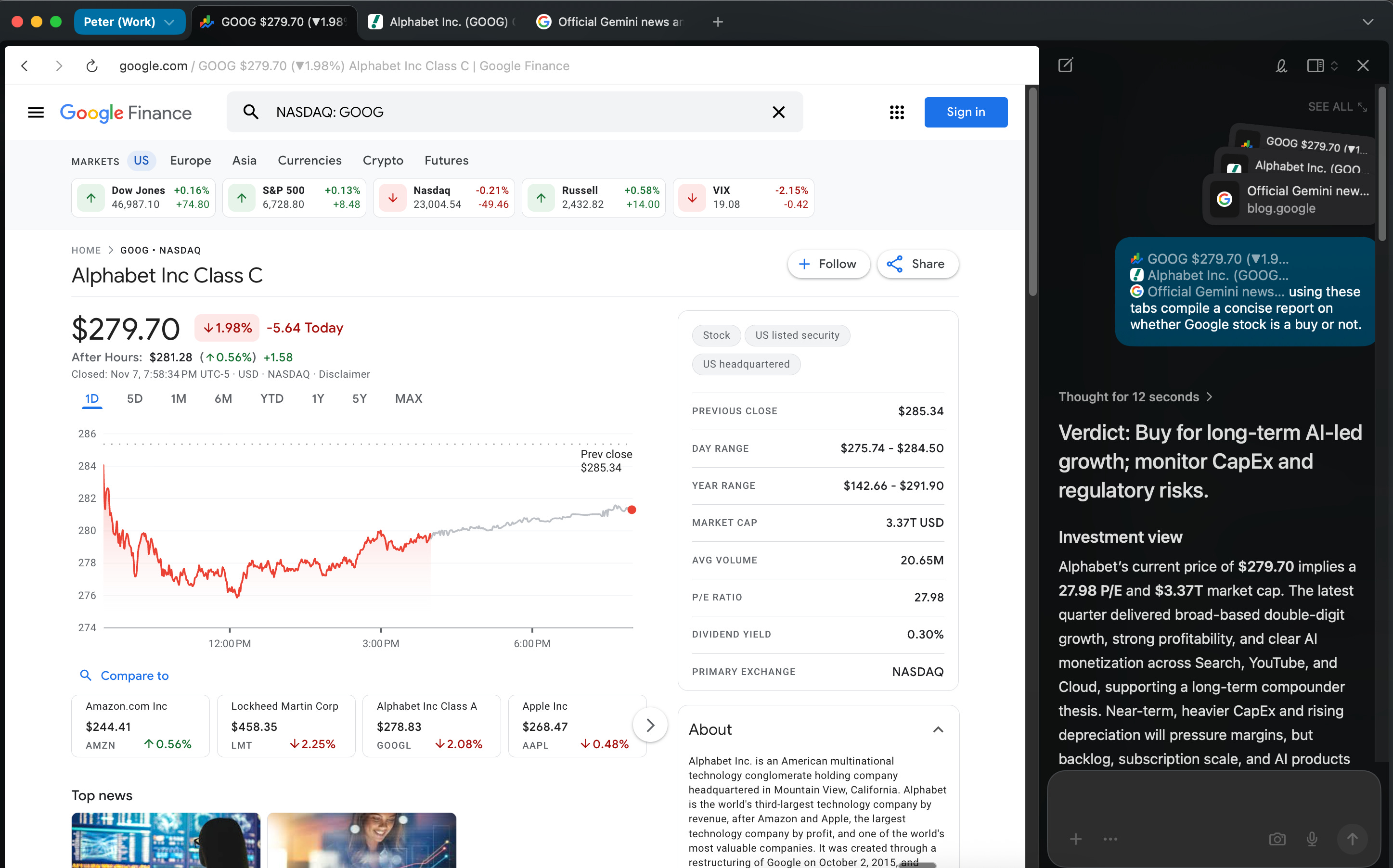“Based on my open tabs, do you think Google stock is a buy?” I asked this question to Dia after opening three tabs — Google Finance for Google stock data, Google’s latest earnings transcript, and the official Gemini blog. Dia took about 33 seconds to create a great investor report for Google’s stock.
