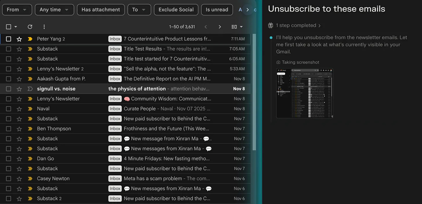 “Unsubscribe to these emails.” Next, I asked Comet to unsubscribe to Stratechery. It opened a Stratechery email, looked for the unsubscribe button, and clicked it. Again, this took forever but you could theoretically pre-filter to spammy emails and just walk away while it does its thing.