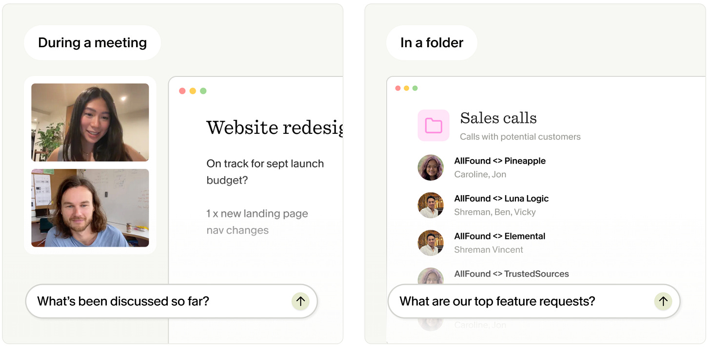 Get answers across meetings. For example, “What are our top feature requests?” after a week of customer calls.