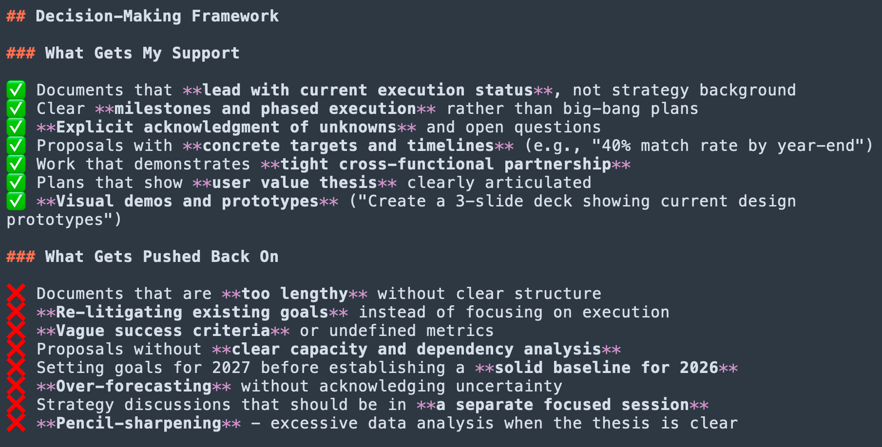 Feedback patterns. Questions that leaders repeat in reviews. For Jagjit, these include: “What have we learned so far? What’s working and what isn’t?” and “What’s the northstar vs. supporting metrics?”