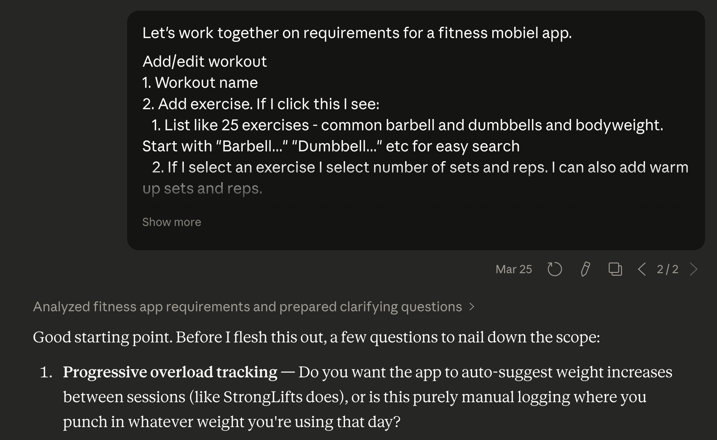 I always include this line when discussing requirements with Claude so that it can ask me questions to make the spec better. Here are a few example questions and answers: