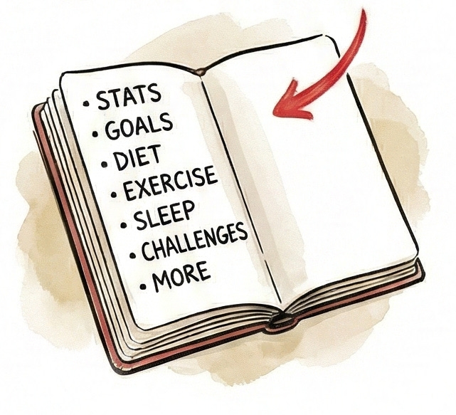 Exercise. Your workout split, exercises, sets, reps, and weights. Include both strength and cardio workouts.