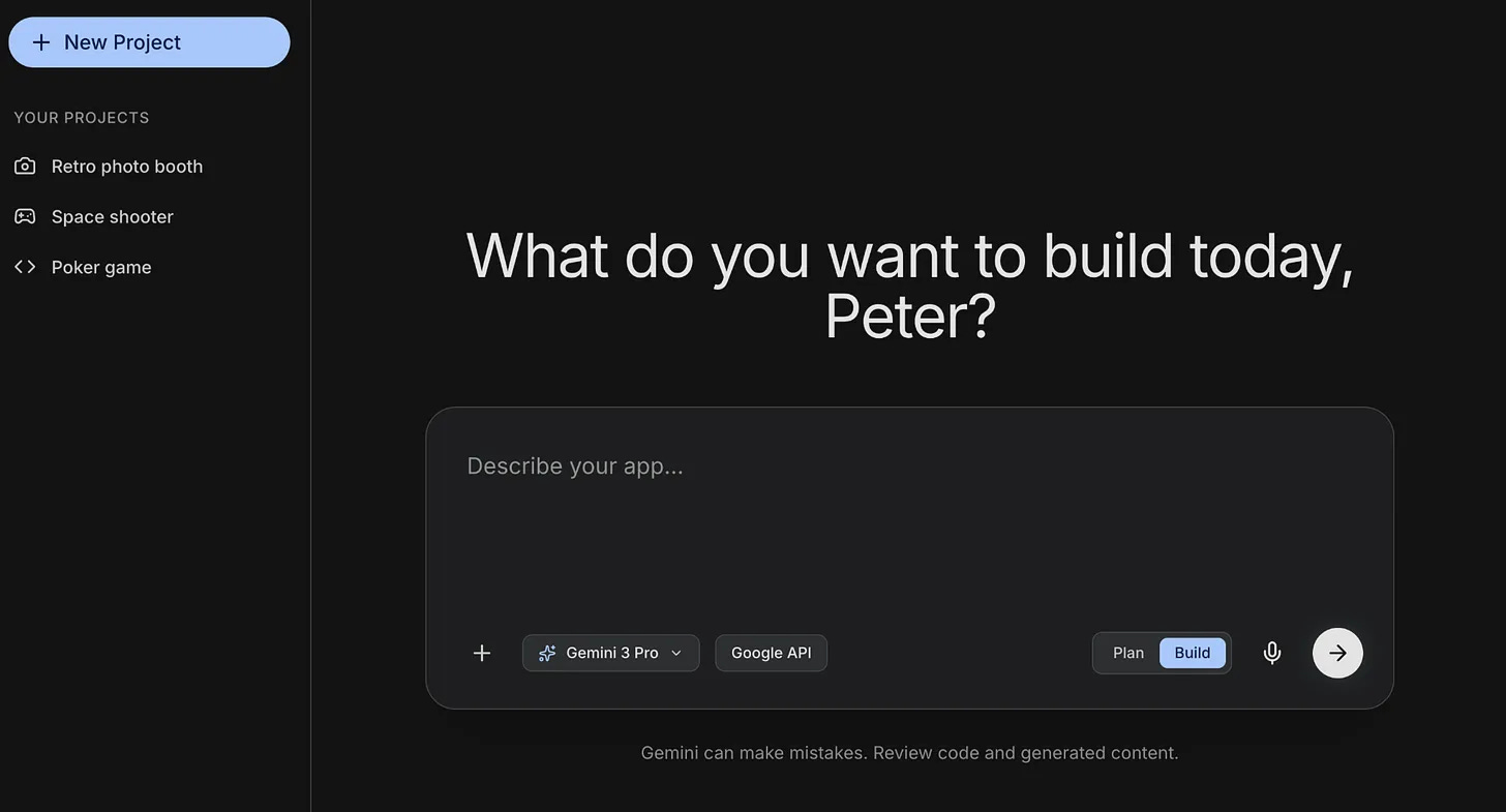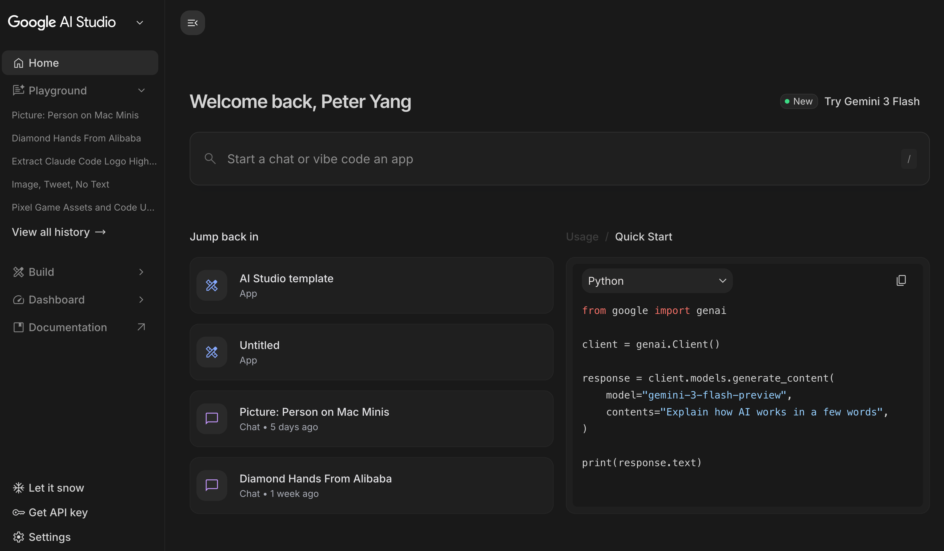 Let’s start by taking some screenshots of Google AI Studio’s Home and Build screens and asking AI: