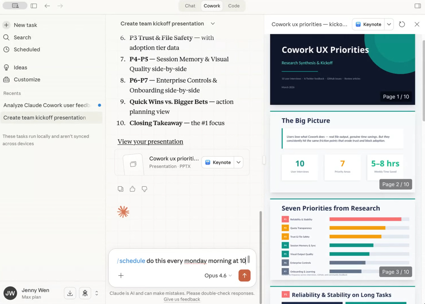 Set up Cowork to deliver a product priorities deck every week. Jenny demoed using Cowork to summarize user feedback from customer calls and social posts. She then asked Cowork to use that feedback to create a product priorities deck. Finally, she scheduled a workflow to share an updated deck in Slack every Monday for her team to review.