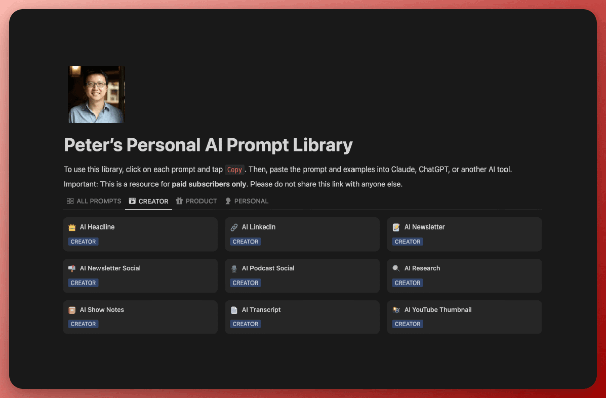 Hi Peter, please explain how to unlock your personal prompt AI library. I signed up for the newsletter perhaps 2 months ago, and I don't understand if the library access is also for such subscribers.