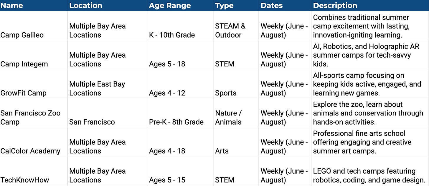 Create a sheet of the top 10 summer camps in the Bay Area for my 7 year old. Include columns for: name, location, age range, type (sports, STEM, arts, nature, etc.), dates, and a short description.