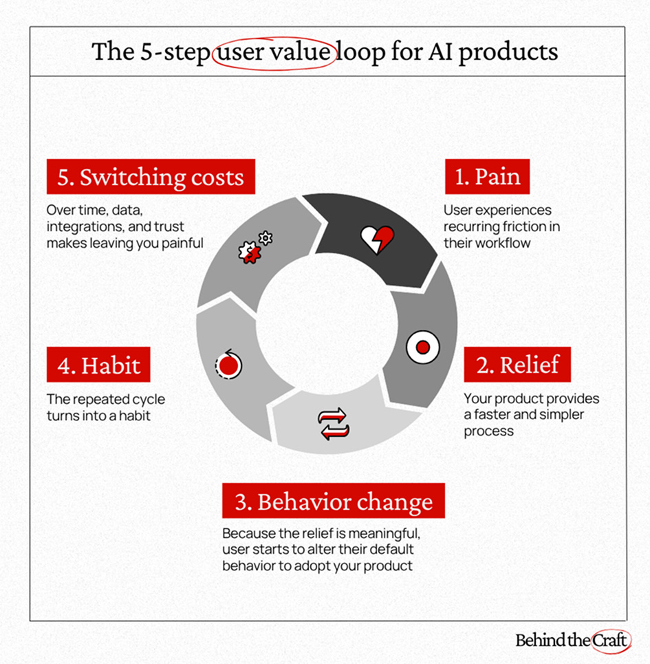 Granola shows that defensibility doesn’t come from the AI model itself. It comes from designing loops where pain turns into relief, relief changes behavior, behavior forms habits, and habits generate data that compounds into a moat.