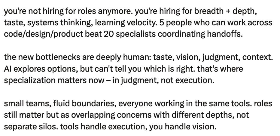Instead, these companies want T-shaped builders — people with deep expertise in one area and enough breadth to contribute to many others. Ryo (Head of Design at Cursor) put it best: