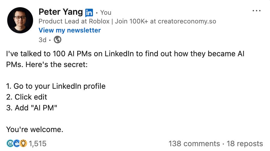 I cringe when I see people post: “I just got my AI PM certificate from XYZ course!” This is the equivalent of putting “AI PM” on your LinkedIn: